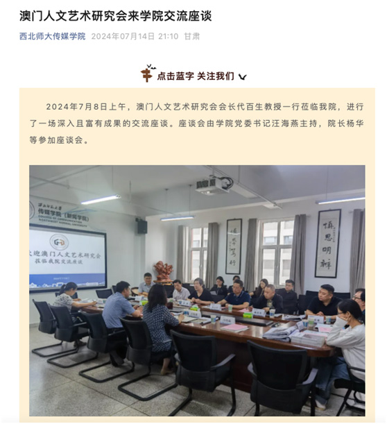 7月8日,澳門人文藝術研究會交流考察團抵達蘭州,首站選擇了與西北師範大學傳媒學院進行座談交流。此次座談由傳媒學院黨委書記汪海燕主持,院長楊華等參與,座談在輕鬆愉快的氛圍中展開,雙方就文化傳播、藝術發展及文藝交流等議題進行了深入探討。